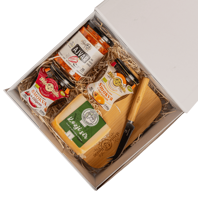 Na elegantnoj drvenoj servirnoj dasci s nožem za sir susreću se domaći kozji sir, ekološki džemovi od smokve s čilijem i maline te blagi ajvar Dida Boža.
